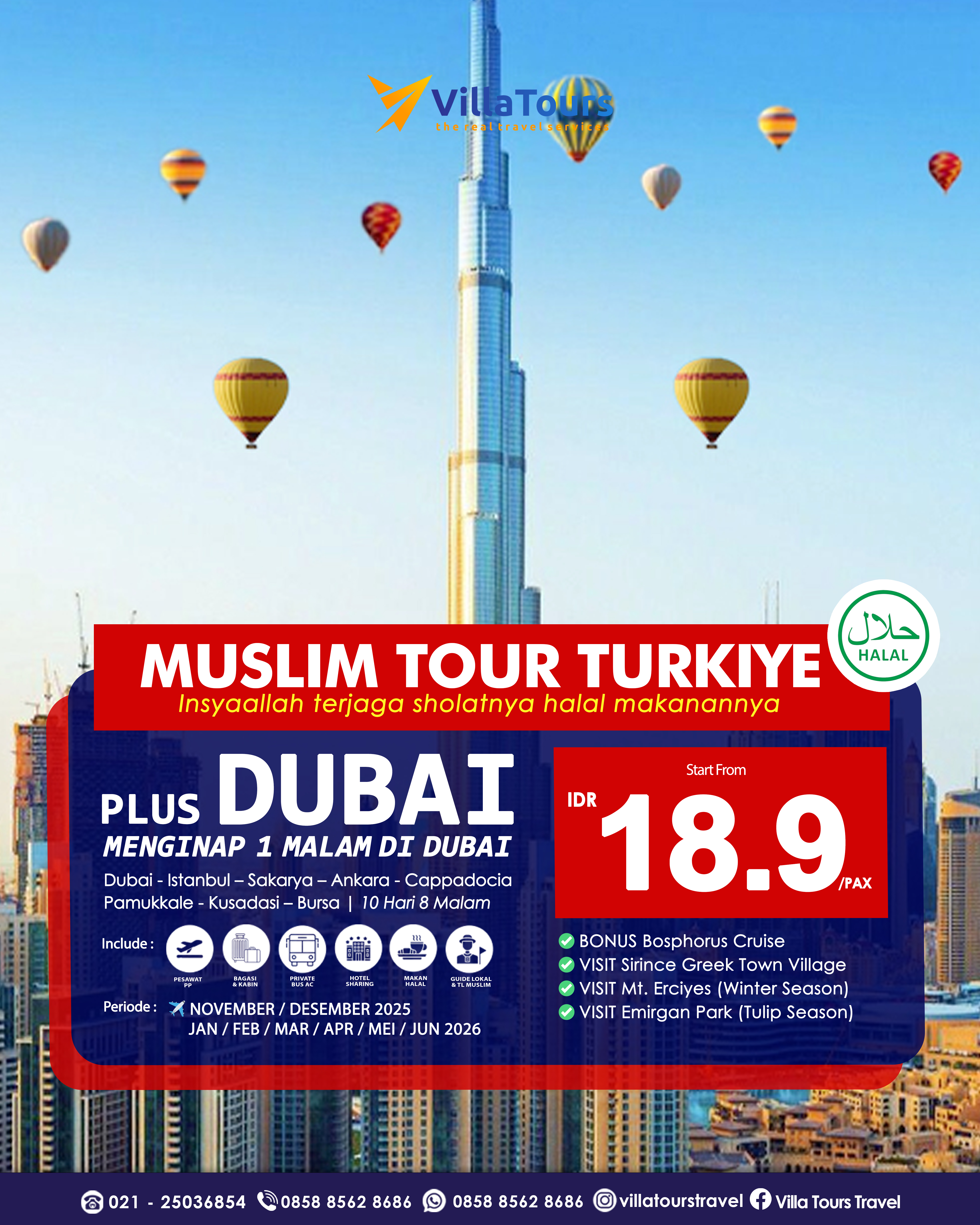 ITINERARY : dapat berubah sewaktu- waktu tanpa pemberitahuan terlebih dahulu menyesuaikan kebijakan pihak airlines, hotel dan partner agent di luar negeri. Segala kerugian yang terjadi baik materil atau immateril yang timbul tidak dapat dibebankan kepada pihak Villa Tours