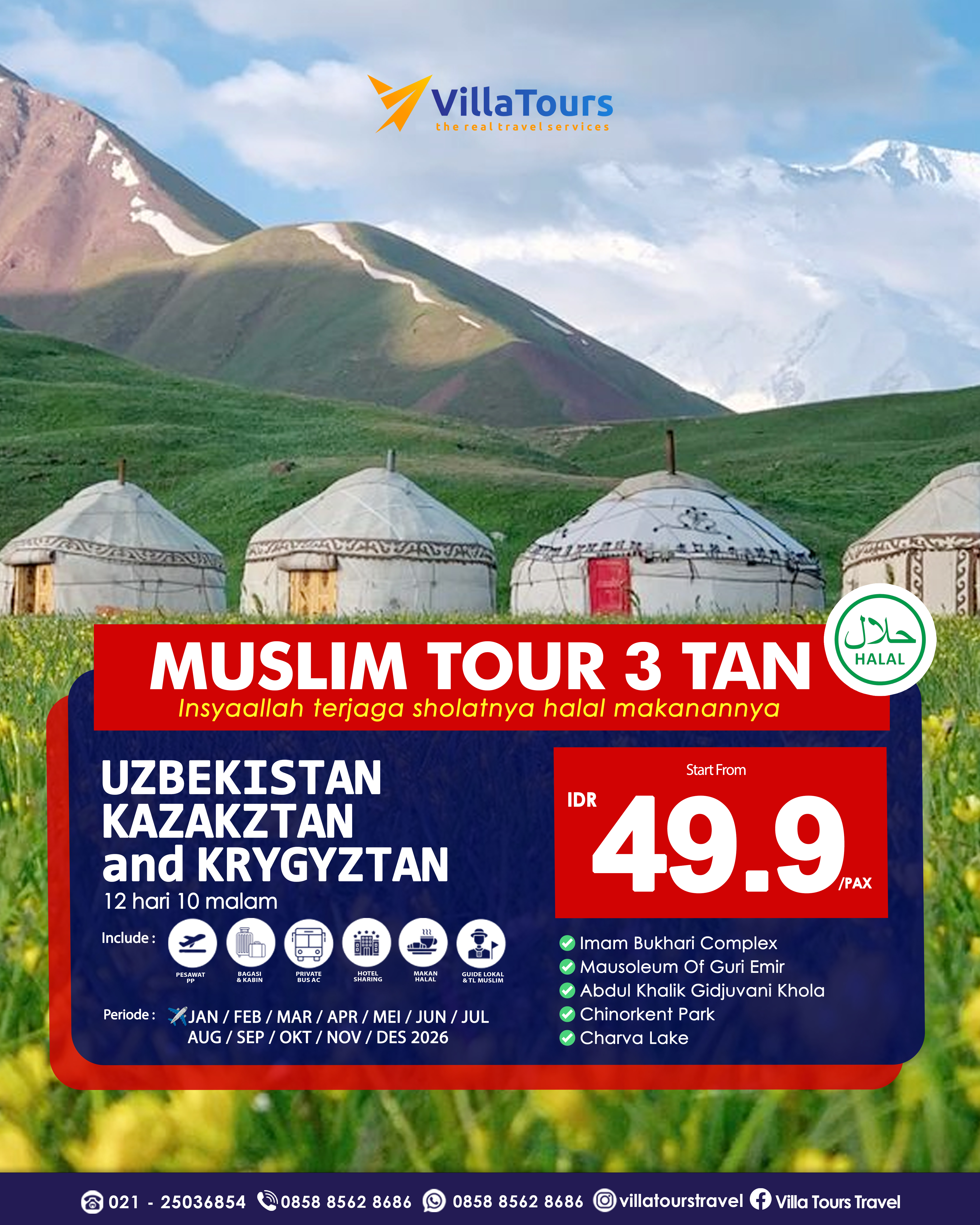 ITINERARY : Jadwal dan Itinerary dapat berubah sewaktu - waktu tanpa pemberitahuan terlebih dahulu menyesuaikan kebijakan pihak airlines, hotel dan partner agent di luar negeri. Segala kerugian yang terjadi baik materil atau immateril yang timbul tidak dapat dibebankan kepada pihak Villa Tours.
