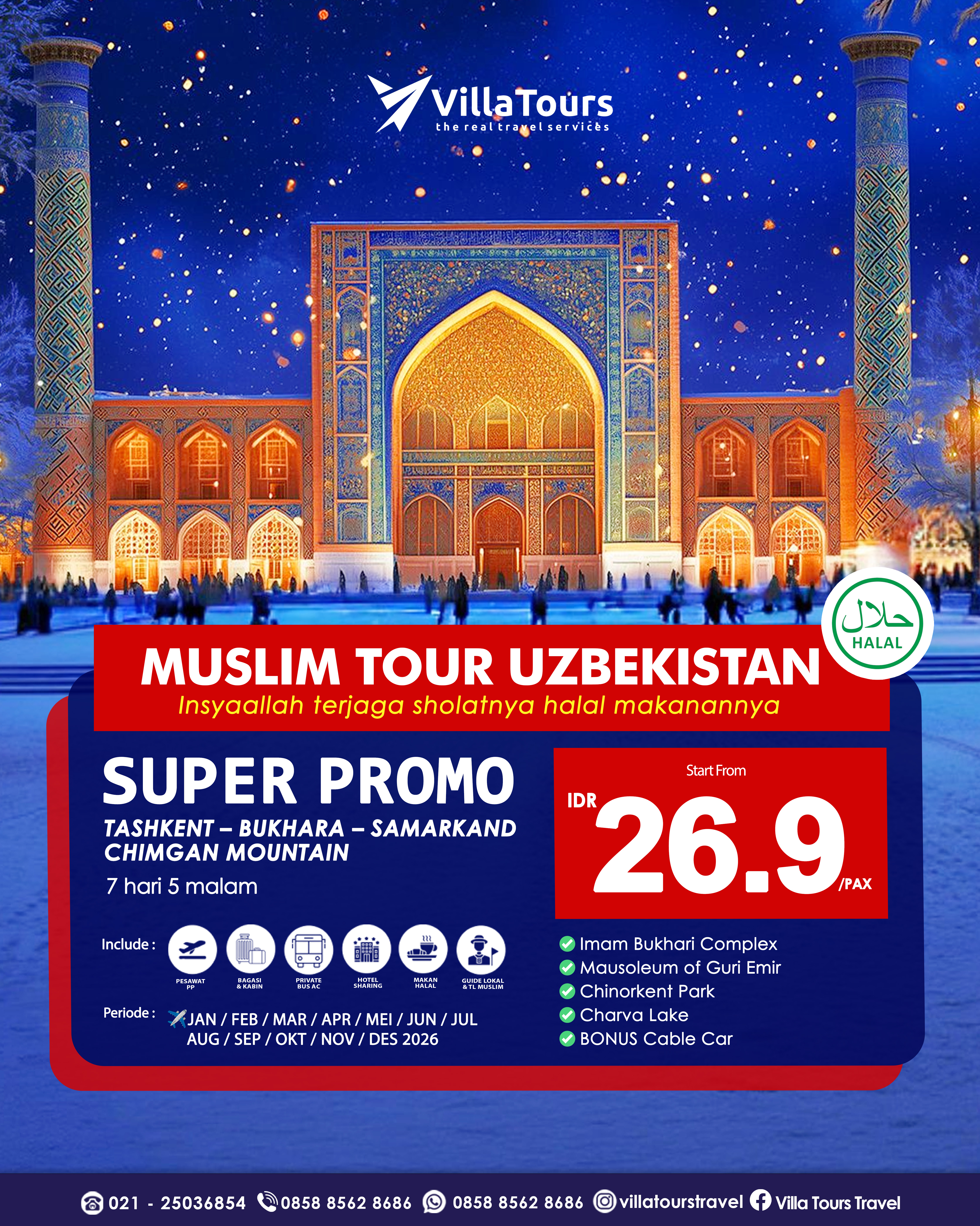 ITINERARY : Jadwal dan Itinerary dapat berubah sewaktu - waktu tanpa pemberitahuan terlebih dahulu menyesuaikan kebijakan pihak airlines, hotel dan partner agent di luar negeri. Segala kerugian yang terjadi baik materil atau immateril yang timbul tidak dapat dibebankan kepada pihak Villa Tours.