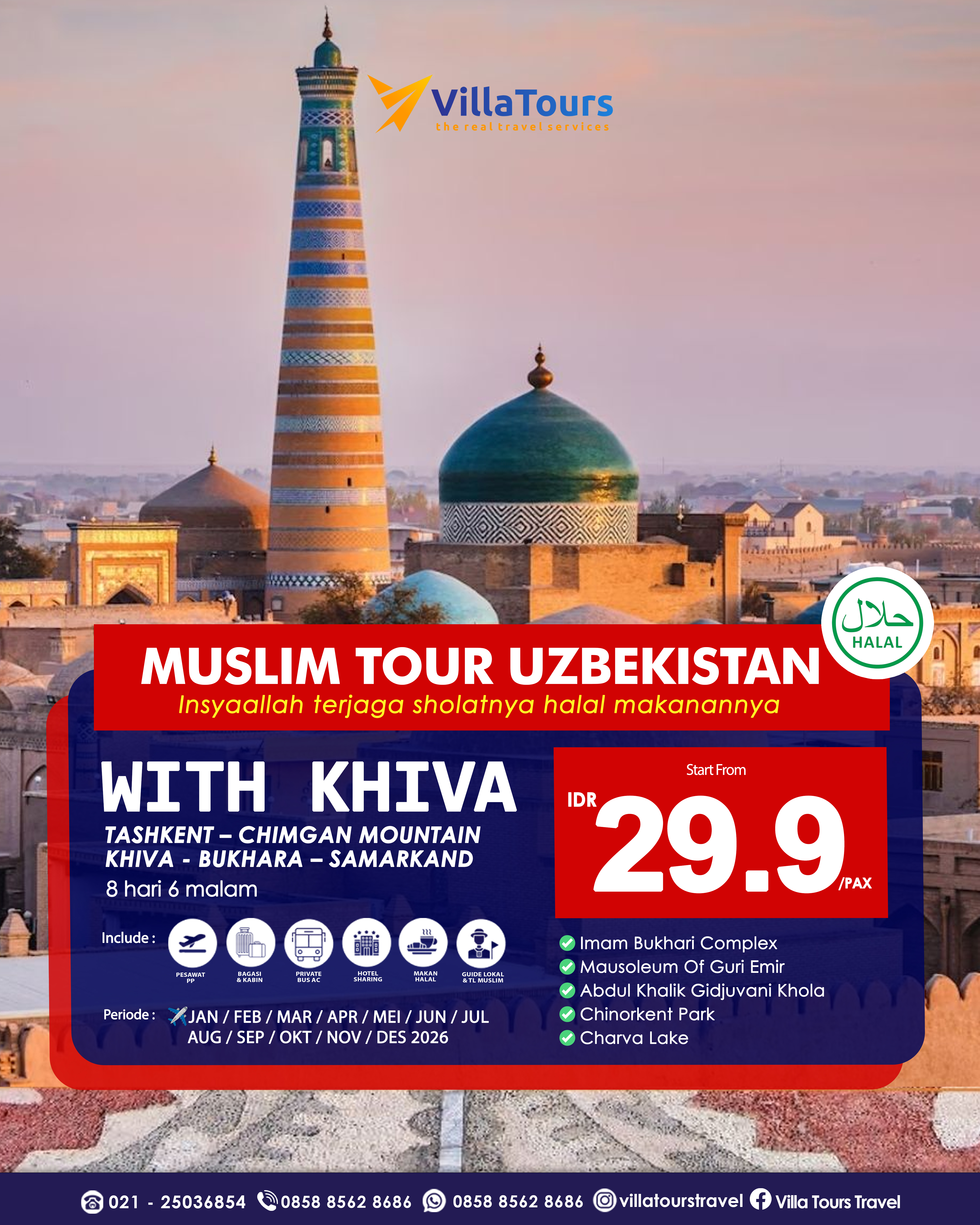 ITINERARY : Jadwal dan Itinerary dapat berubah sewaktu - waktu tanpa pemberitahuan terlebih dahulu menyesuaikan kebijakan pihak airlines, hotel dan partner agent di luar negeri. Segala kerugian yang terjadi baik materil atau immateril yang timbul tidak dapat dibebankan kepada pihak Villa Tours.