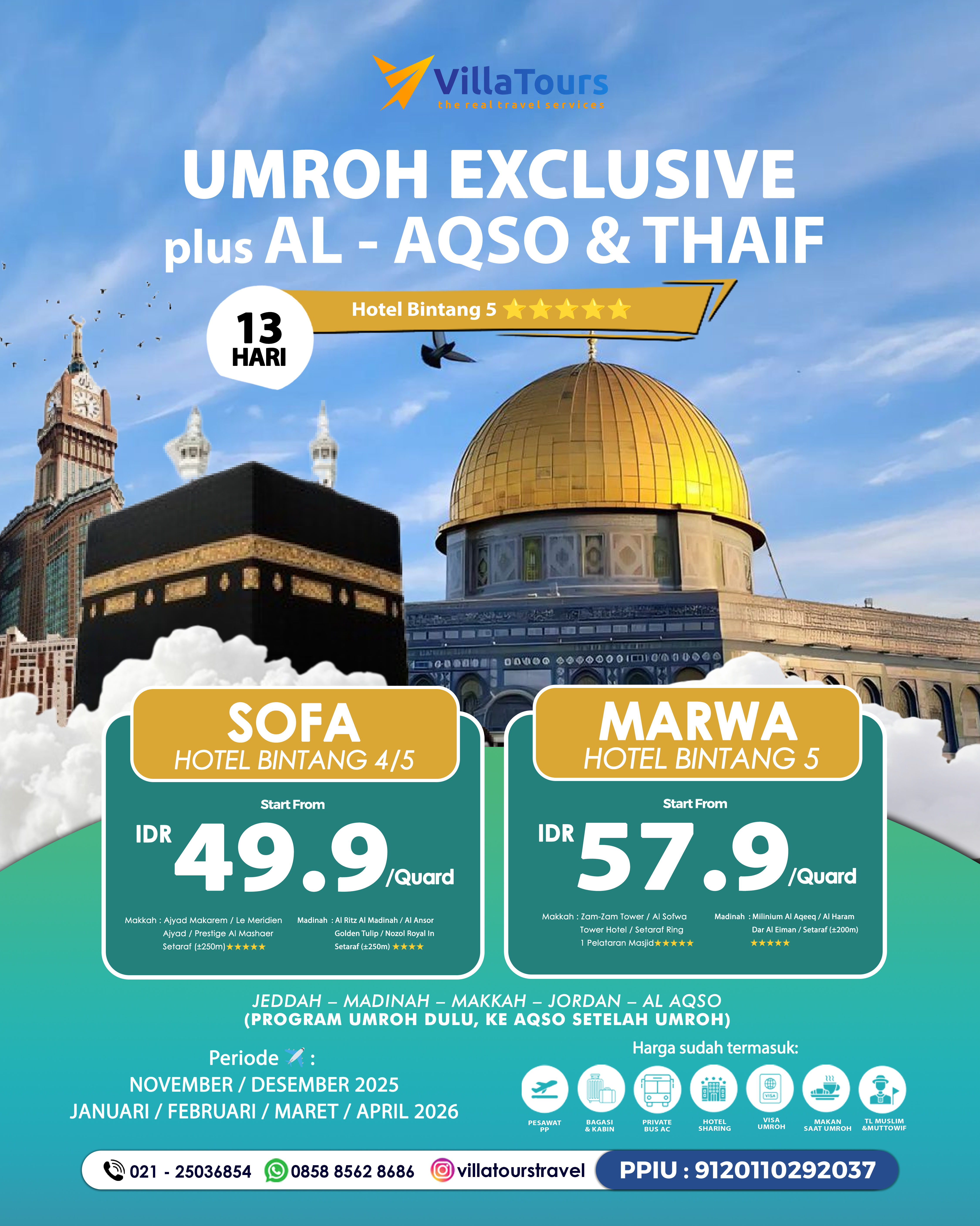 ITINERARY: Jadwal dan Itinerary dapat berubah sewaktu-waktu tanpa pemberitahuan terlebih dahulu menyesuaikan kebijakan pihak airlines, hotel dan partner agent di luar negeri. Segala kerugian yang terjadi baik materil atau immateril yang timbul tidak dapat dibebankan kepada pihak Villa Tours.