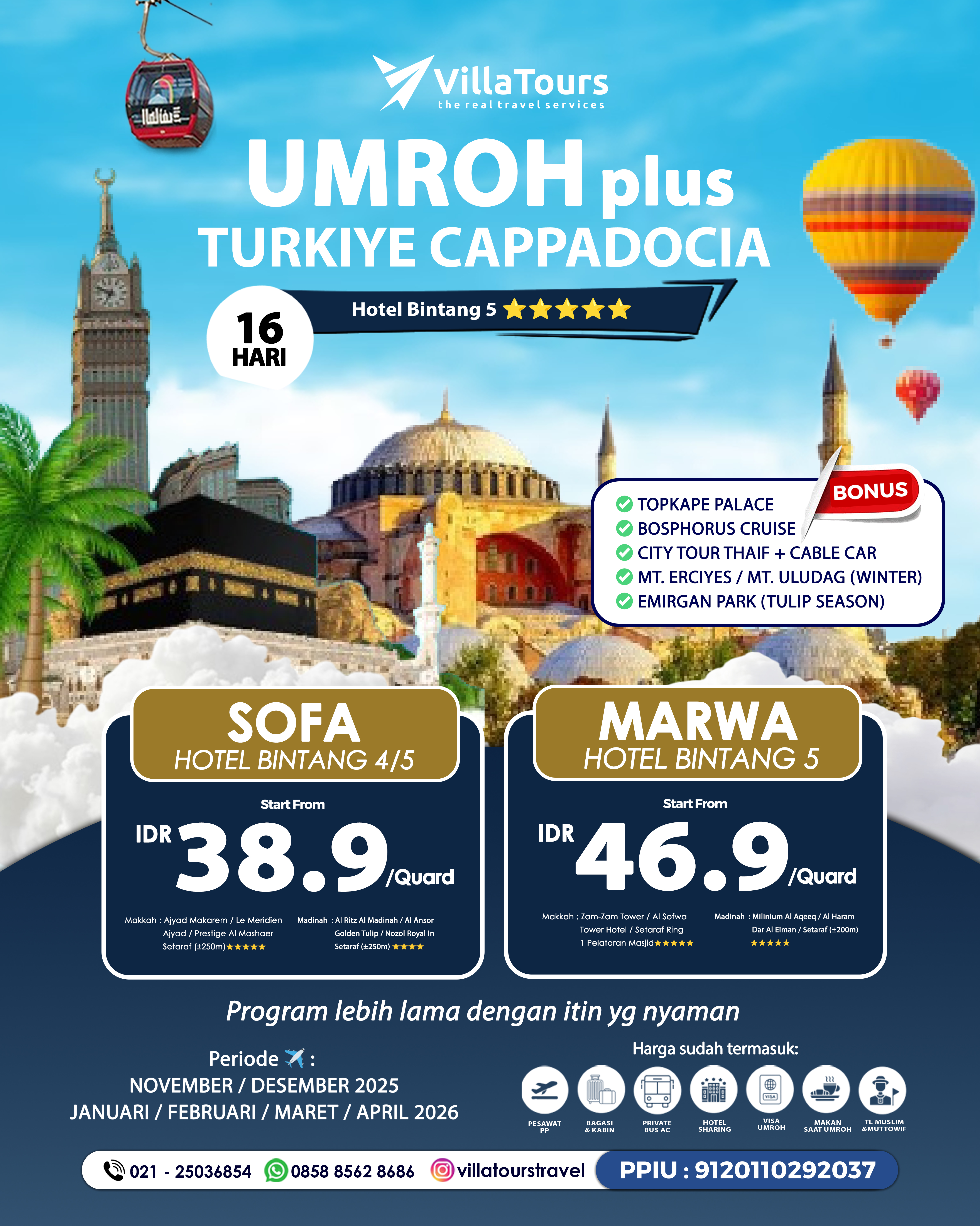 HARGA: dapat berubah sewaktu-waktu tanpa pemberitahuan terlebih dahulu, walaupun pembayaran uang muka telah dilakukan menyesuaikan kurs dan kebijakan pemerintah Indonesia dan Kerajaan Saudi Arabia.