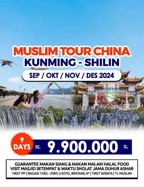 - Setelah sarapan, Anda akan diantar ke masjid untuk sholat. Dilanjutkan menuju HERBAL MEDICINE MUSEUM dan ZHENGHE THEME PARK, sebelumnya dikenal dengan nama MOON MOUNTAIN PARK, yang berlokasi di Jinning District. Tokoh Zhenghe, seorang Muslim, adalah penjelajah laut petama dari Tiongkok, yang melakukan perjalanan ke Barat sebanyak 7 kali pada 600 tahun yang lalu. Tokoh ini mempunyai peranan penting dalam membina hubungan harmonis antara Tiongkok dan negara negara lain. Taman ini didirikan untuk mengenang tokoh besar ini. Anda dapat juga mengunjungi ZHENGHE MONUMENT PAVILION & ZHENGHE MEMORIAL HALL di dalam taman tersebut. Perjalanan dilanjutkan menuju Shilin. Malam hari Anda akan diajak untuk mengikuti acara BONFIRE PARTY.