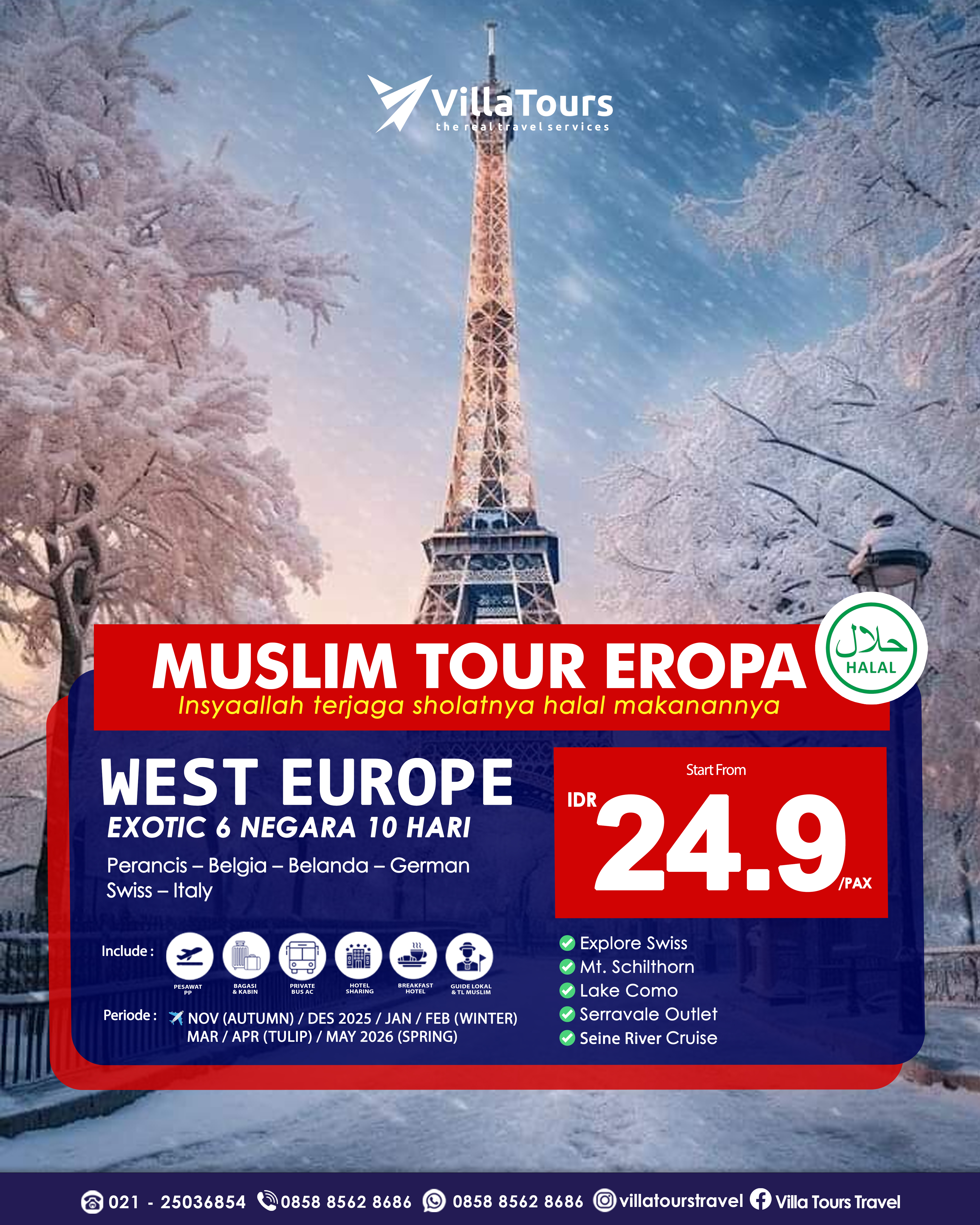 Jadwal & Itineray perjalanan (HOTEL & RUTE BUS) dapat berubah sewaktu-waktu tanpa pemberitahuan terlebih dahulu kepada peserta, sesuai dengan kebijakan Airlines, ketersediaan kamar hotel, regulasi Bus di Eropa dan menyesuaikan Musim di Eropa.