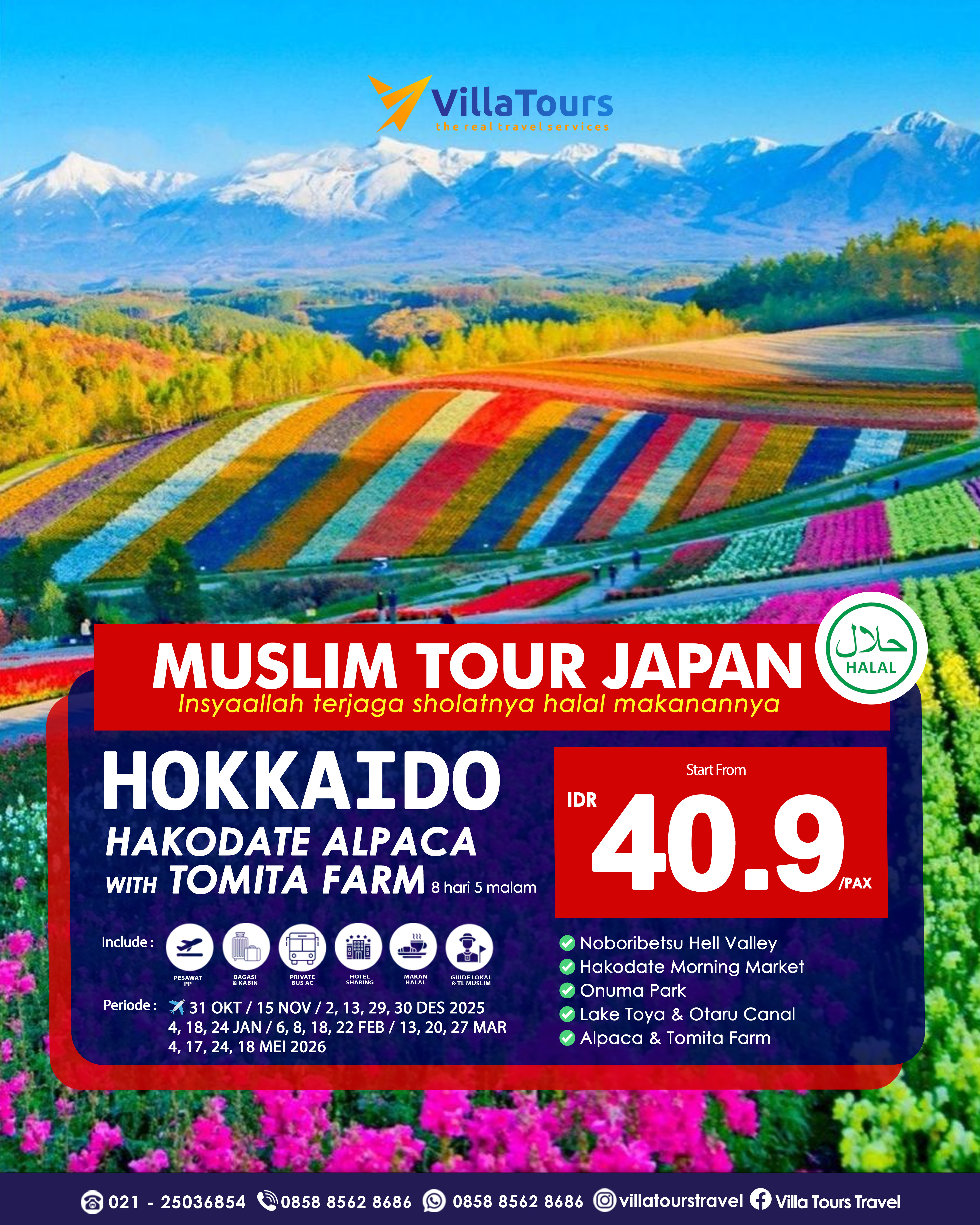 ITINERARY : Jadwal dan Itinerary dapat berubah sewaktu-waktu tanpa pemberitahuan terlebih dahulu menyesuaikan kebijakan pihak airlines, hotel dan partner agent di luar negeri. Segala kerugian yang terjadi baik materil atau immateril yang timbul tidak dapat dibebankan kepada pihak Villa Tours.