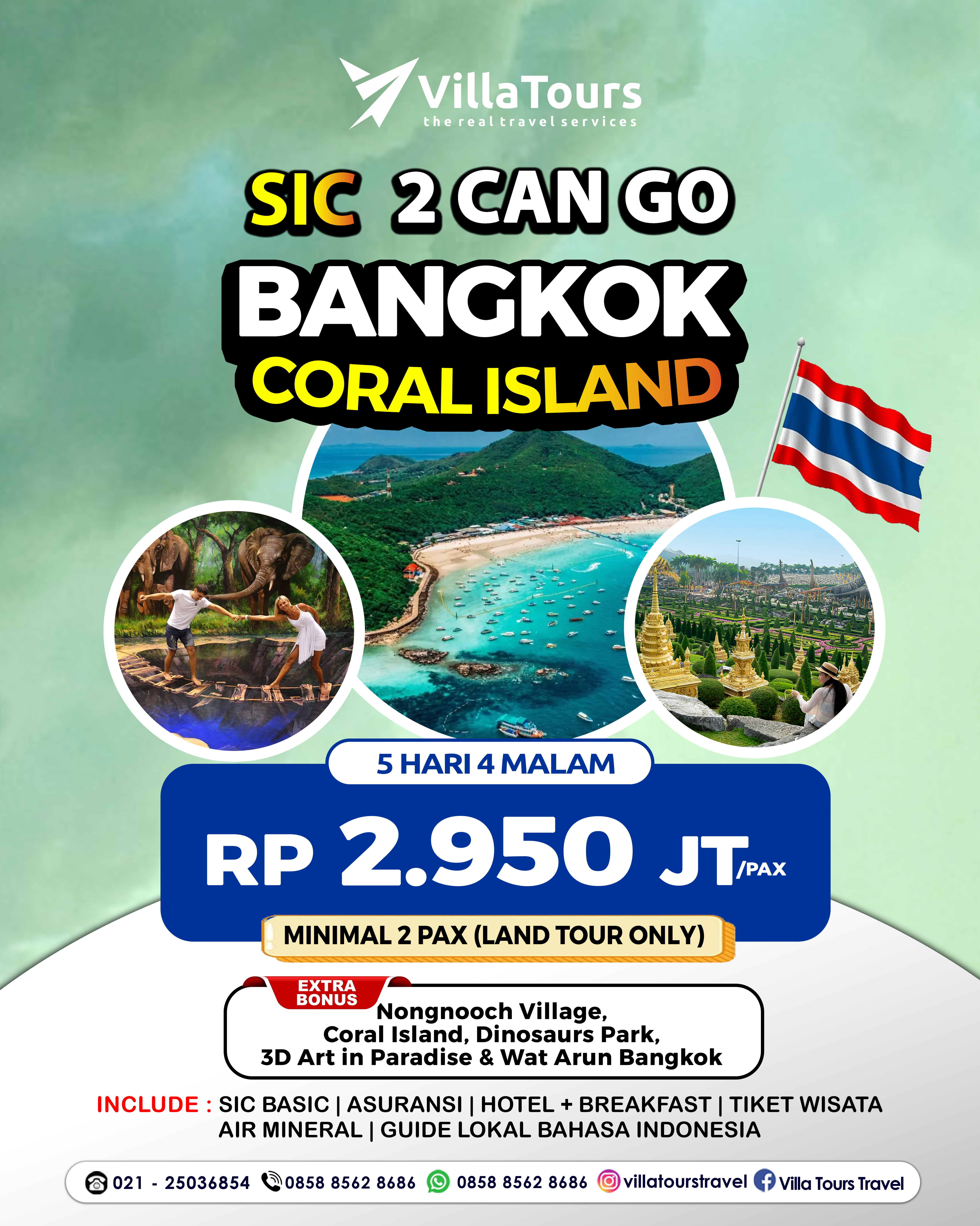 - ABF at Hotel, transfer to the Beach, take Speed Boat to Coral Island (15-20 mins), enjoy on the beach, additional watersport (snorkeling, parasailing, jet ski, banana boat) at Coral Island, transfer back to hotel, sightseeing Pattaya City with songthew, visit 3D Art in Paradise, shopping at Terminal 21 Pattaya, enjoy night live at Pattaya Walking Street and Dinner at walking street (with own expense), back to hotel