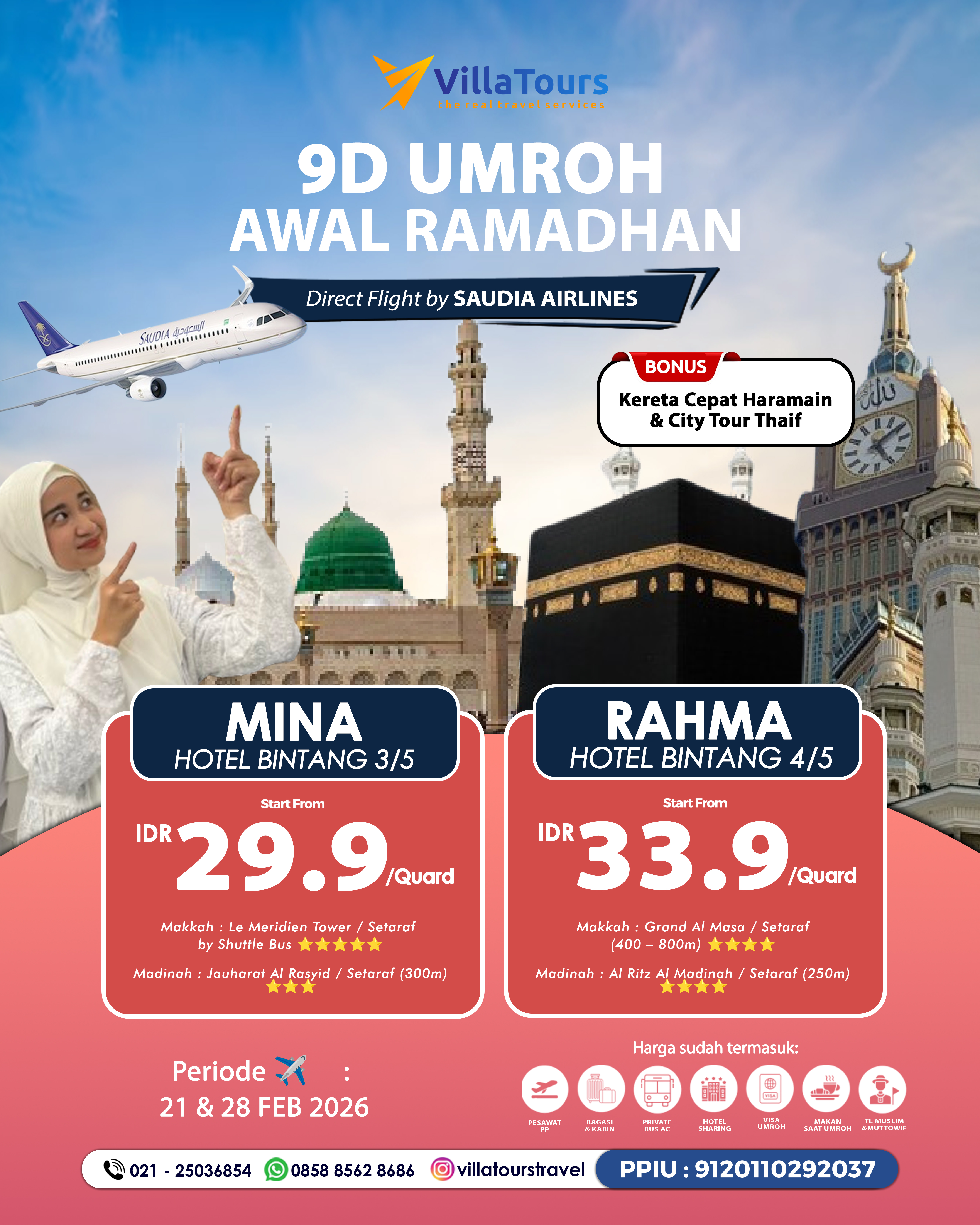 FORCE MAJEUR : Dalam hal terjadi keadaan force majeur/terpaksa/tidak teratasi karena jama’ah yang meninggal sebelum pemberangkatan ataupun dalam perjalanan, terjadi Kerusuhan serta suasana mencekam baik di negara asal maupun dinegara tujuan, dan lain-lain, VILLA TOURS berhak, tanpa pemberitahuan terlebih dahulu kepada Jamaah, merubah rencana perjalanan, baik susunan maupun jadwalnya, hal mana perubahan itu dilakukan demi kepentingan dan keamanan Jamaah serta kelancaran perjalanan. Dalam hal ini tidak ada pengembalian uang atas service yang tidak digunakan. Namun jika perubahan itu menimbulkan biaya tambahan, maka seluruh biaya tambahan ditanggung oleh Jamaah.