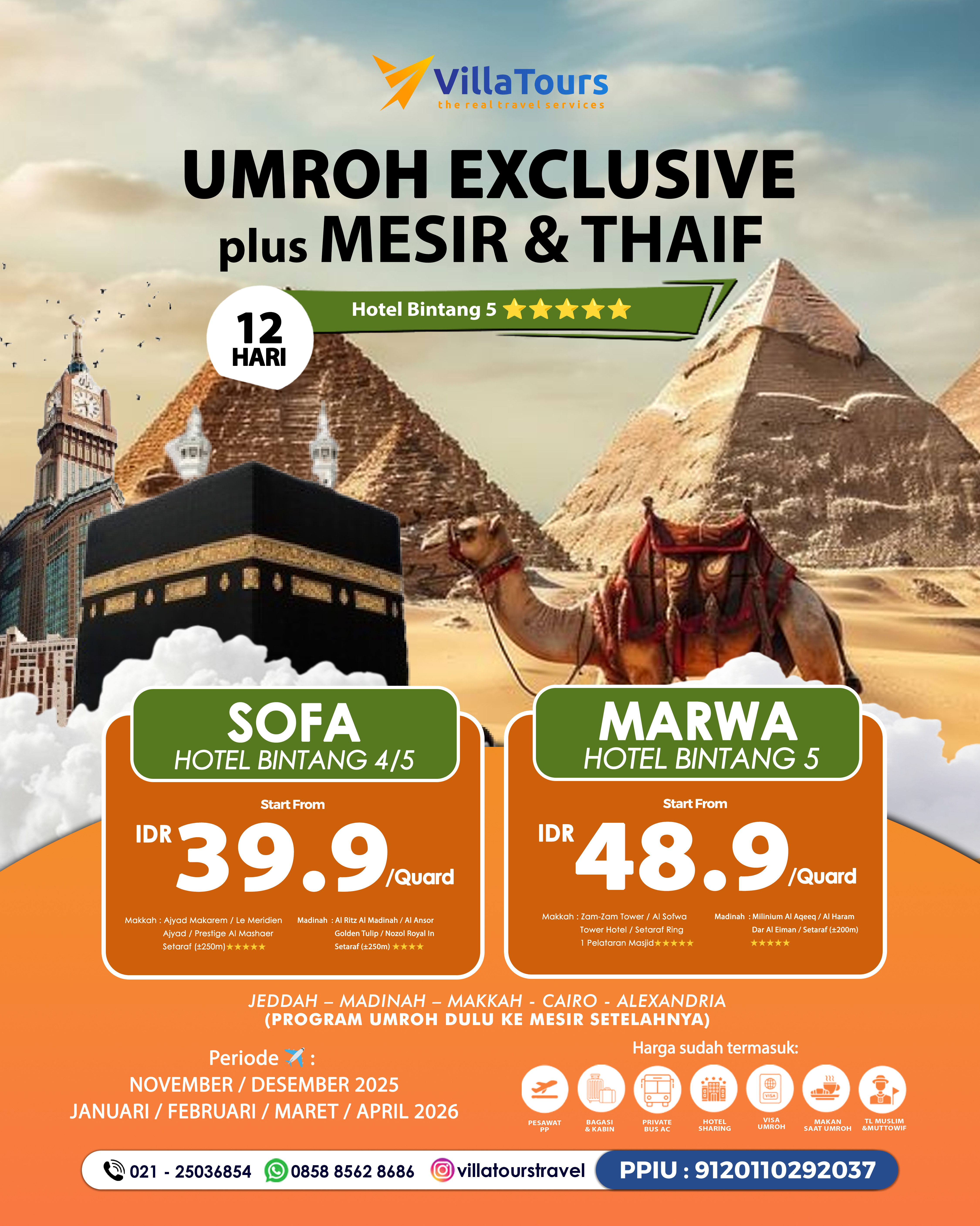 ITINERARY: Jadwal dan Itinerary dapat berubah sewaktu- waktu tanpa pemberitahuan terlebih dahulu menyesuaikan kebijakan pihak airlines, hotel dan partner agent di luar negeri. Segala kerugian yang terjadi baik materil atau immateril yang timbul tidak dapat dibebankan kepada pihak Villa Tours.